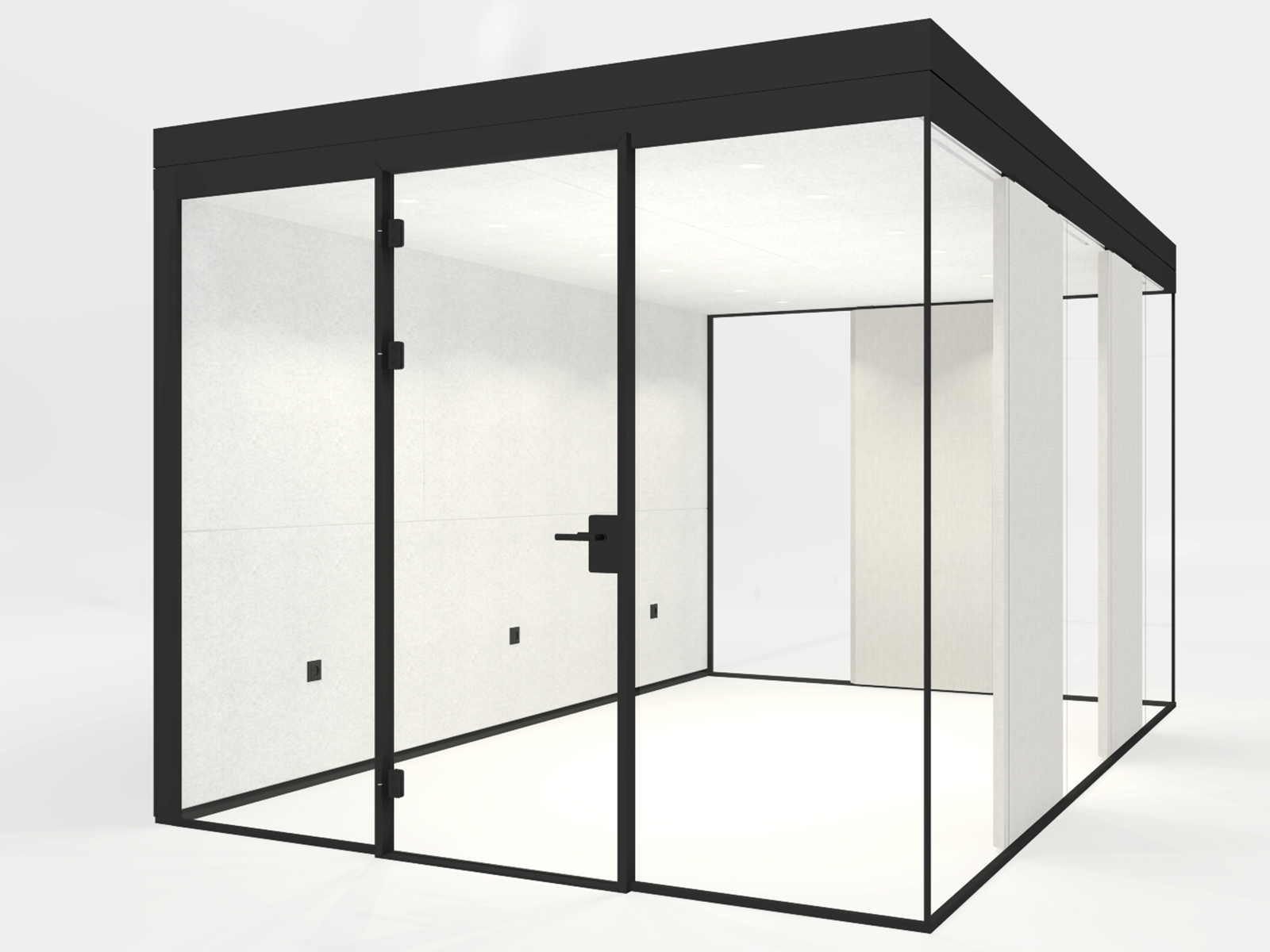 Het glas, de wanden, het plafond en de deur zijn gemaakt van materialen met een minimale Rw-waarde van 37 dB.
