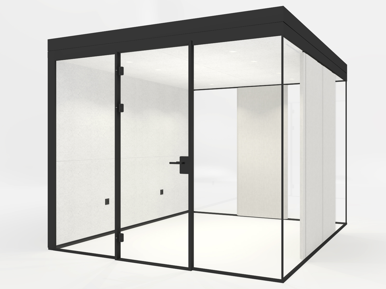 Het glas, de wanden, het plafond en de deur zijn gemaakt van materialen met een minimale Rw-waarde van 37 dB.
