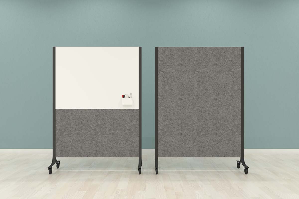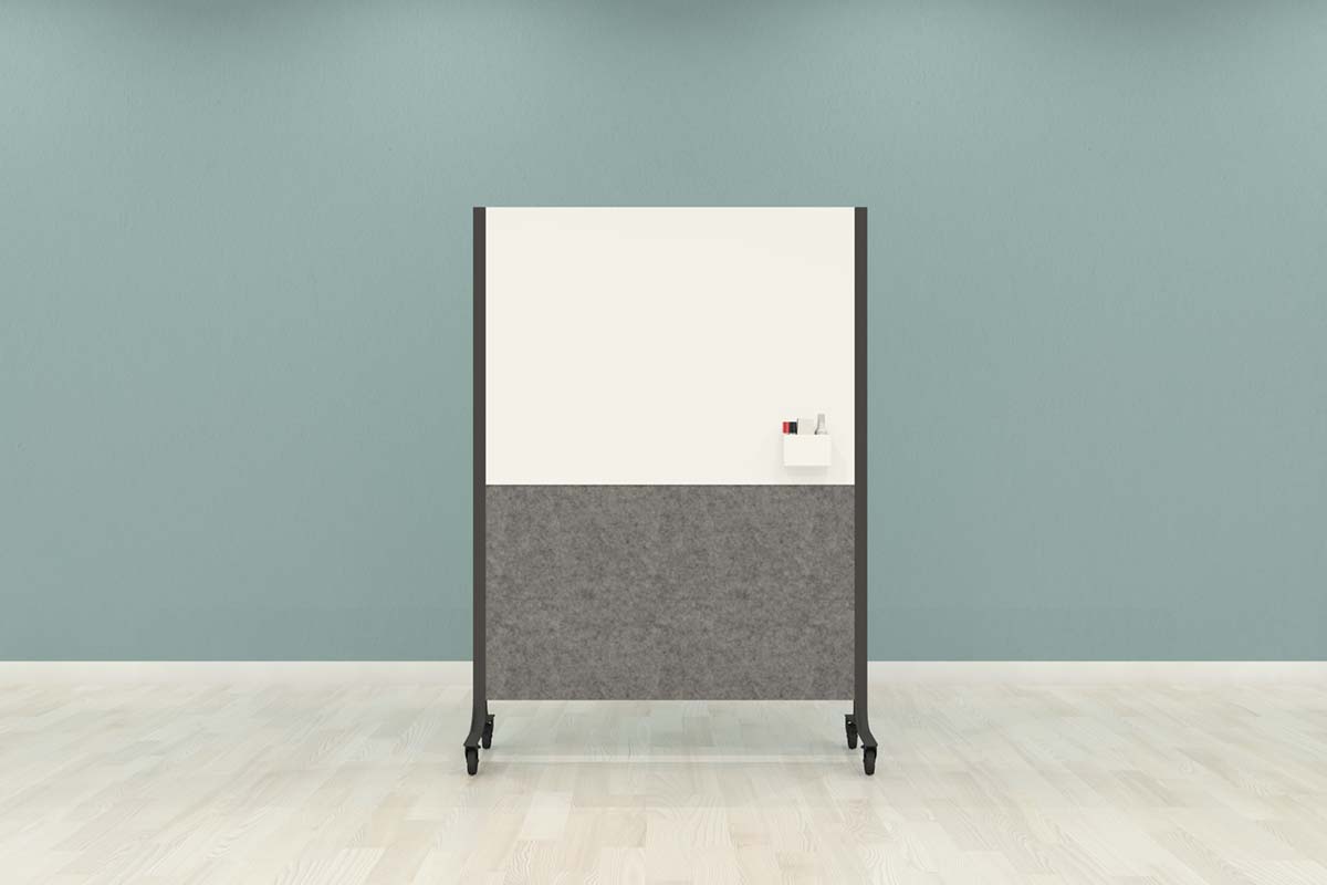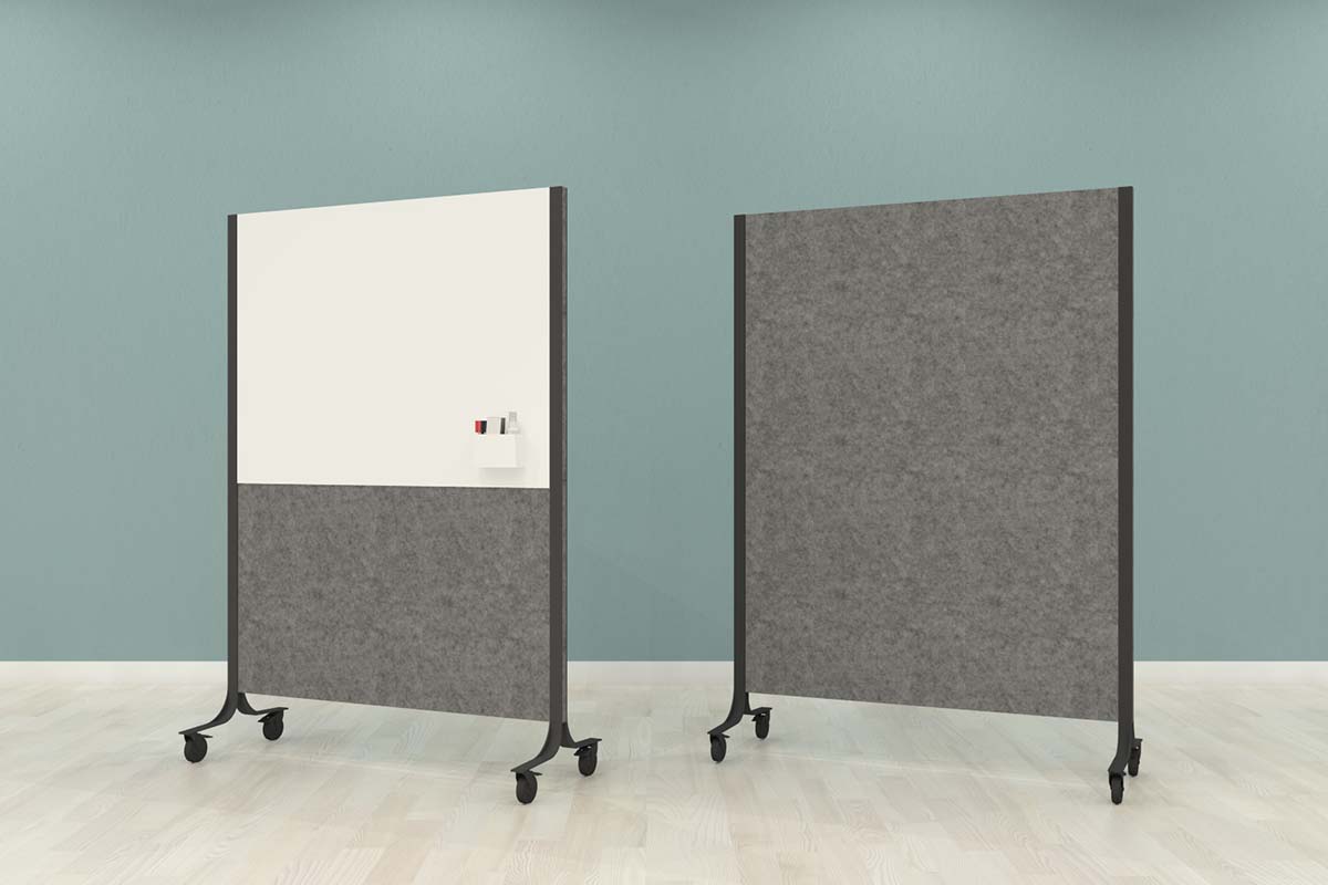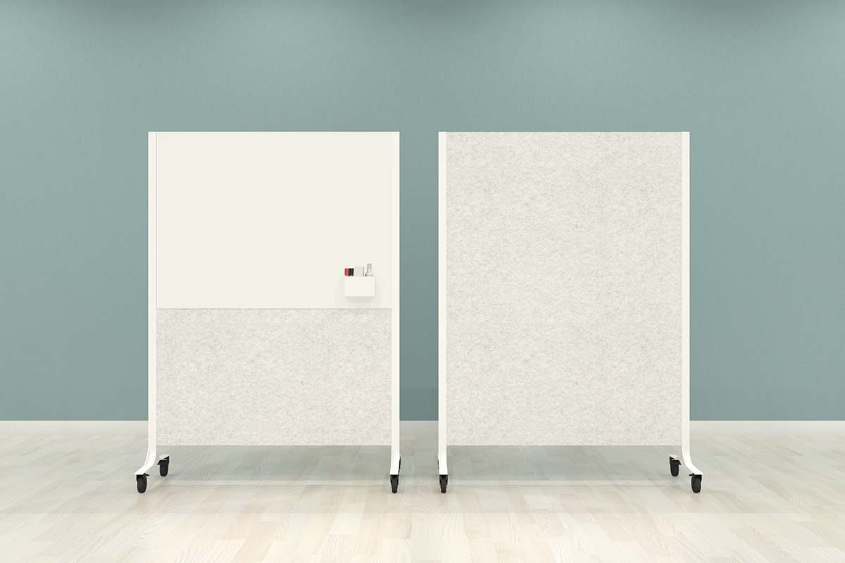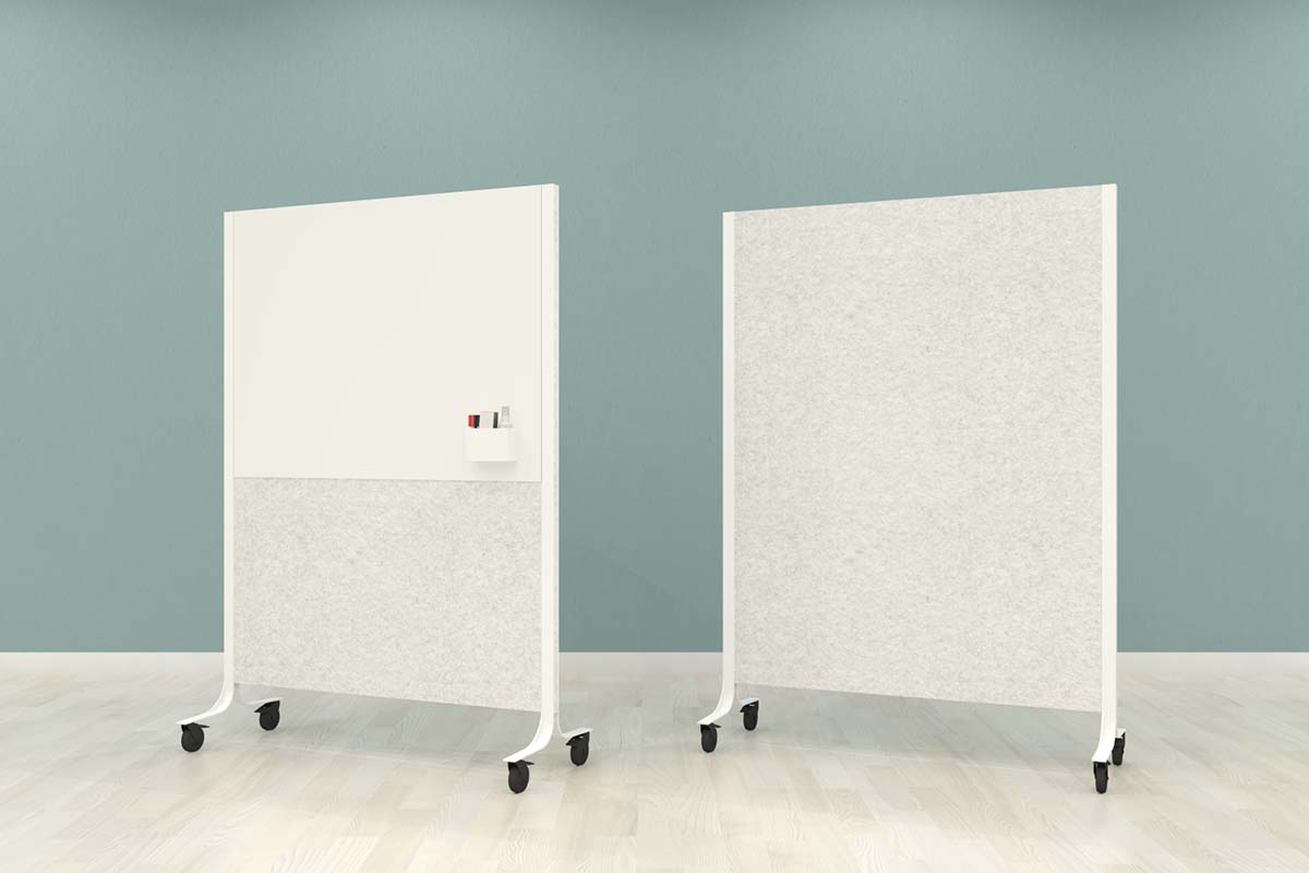 verkrijgbaar in twee kleuren, lichtgrijs of antraciet. Met enkelzijdig of dubbelzijdig whiteboard, maar ook alleen als akoestisch paneel. Het frame is te leveren in een witte of zwarte variant.